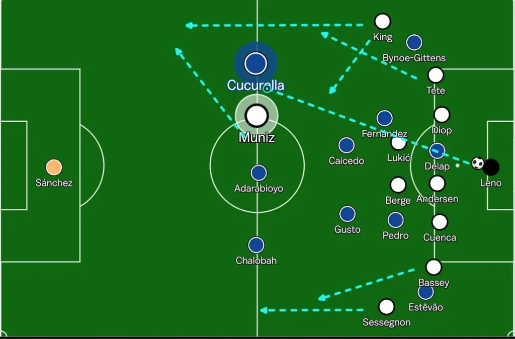 That’s enough on how Fulham defend our SW6 territory. How do we win? Don’t worry fellas and felletes, I’m about to tell you. As I’ve shown, Chelsea deploy a box midfield, inverting their full backs, Gusto into the middle of the park, as Cucuerlla tucks inside to form a back three. If Fulham can break at speed, Maresca’s merry bunch of mugs can be exposed out wide. Keep a rigid midfield base, and play the outlet wide ball. Exploit the space left by Gusto’s central inroads, and Cucurella’s tendency to tuck into a back three. Play into the channels, off Muniz, or emulate our first half passages of play we flashed against Bristol City, with quick, concise passages of play unleashing the Whites’ wide options.