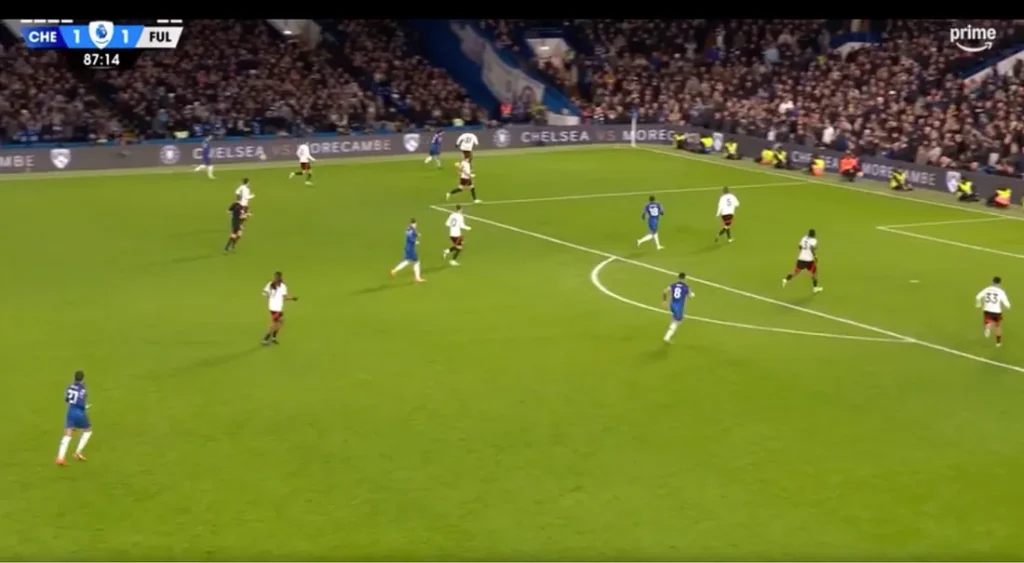 How can Fulham counteract Maresca’s box midfield, and touchline hugging wingers? Well, simply, be compact, pack numbers. Start in a back five. Sit deep, deploy a low block. Fulham mastered this last season. In our famous last vist, Silva neutralised a side who were supposedly title contenders. We pushed SW6’s unwanted child wide by staying compact in a back five. The Whites deployed defensive discipline to prevent Sancho and Neto from isolating Kenny Tete or Antonee Robinson, forcing the Blues into ‘empty’ crosses into a defensive box with no aerial threat – as you can see below: