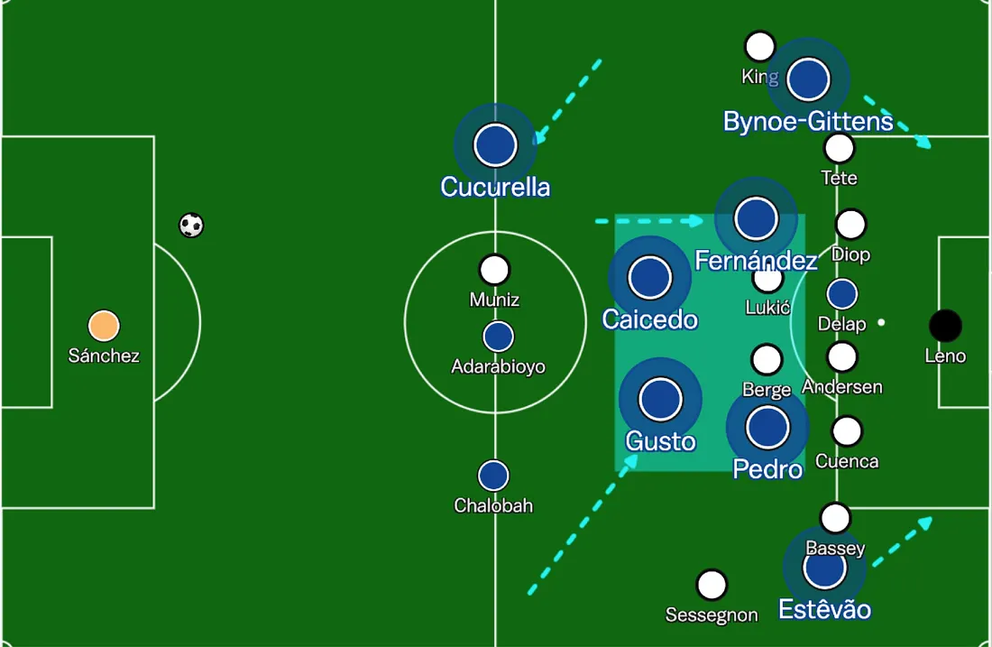 Fulham have to start in a back five, so, of course, it’s the same as our last visit to the Bridge, 5–4–1. Kenny Tete loses his spot in a back three, instead slotting into his right wing back, to make way for the added need of physical presence to deal with Liam Delap in defence.
